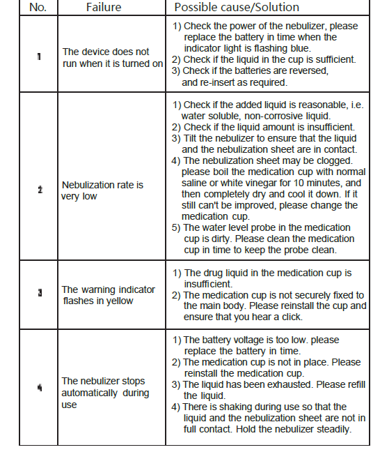 If you have any problem or doubt when using the nebulizer, please troubleshoot according to the following list.
