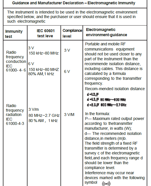 • The instrument conforms to the requirements of IEC60601- 1 - 2 standard for electromagnetic compatibility.